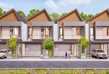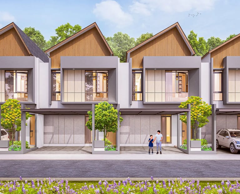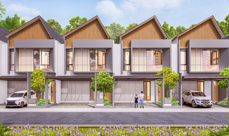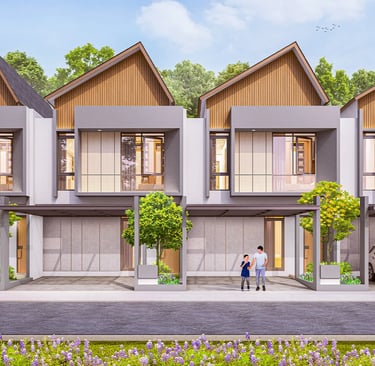 Desain arsitektur urban minimalis yang dipadukan dengan sentuhan alam dan ruang terbuka hijau yang menyegarkan.