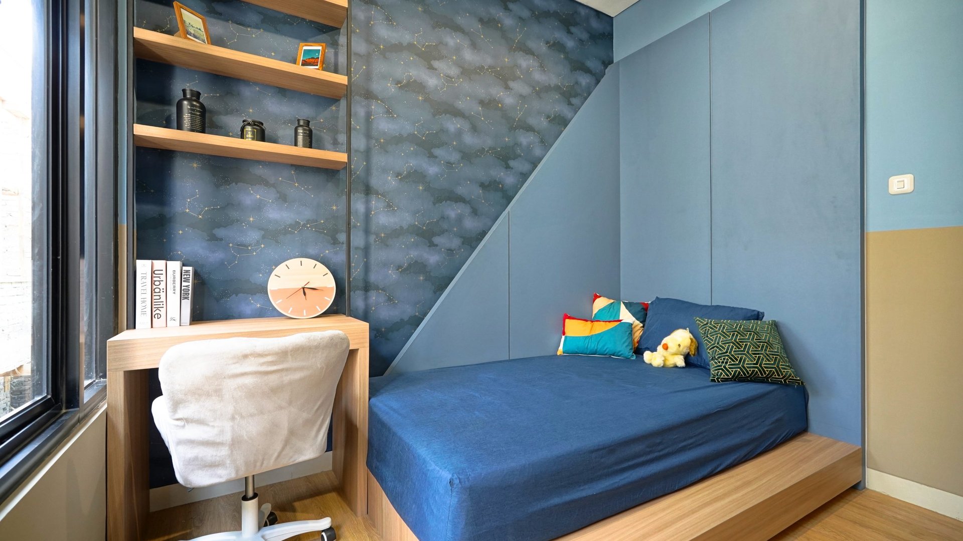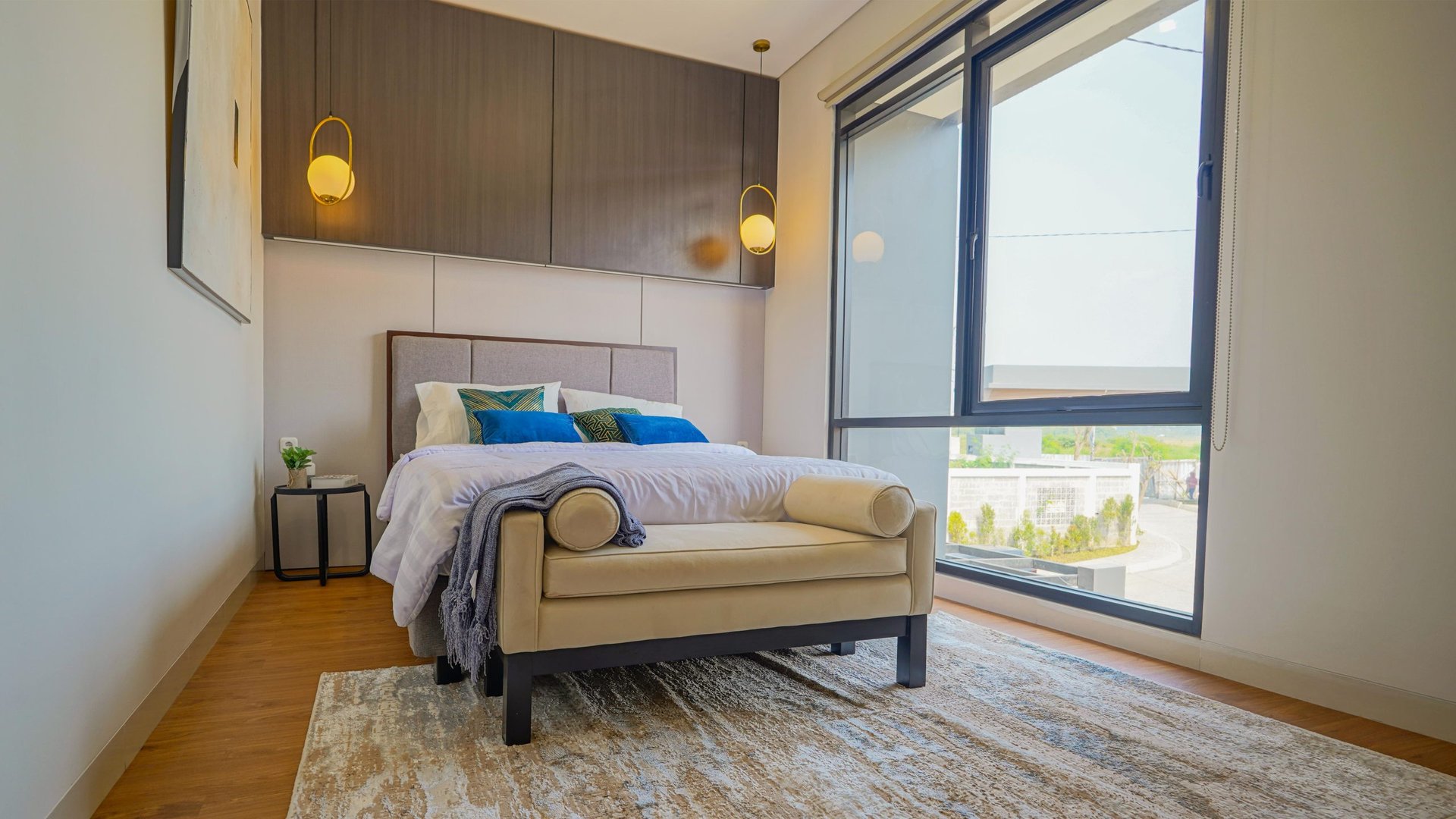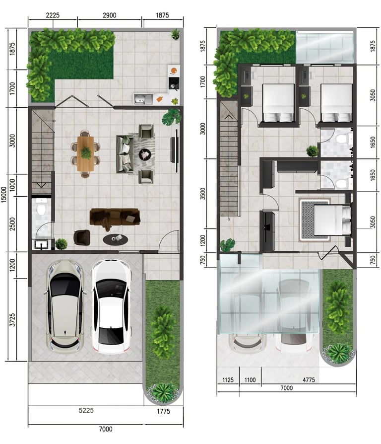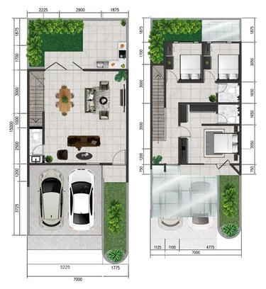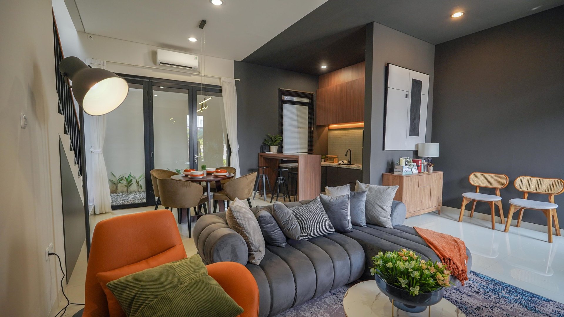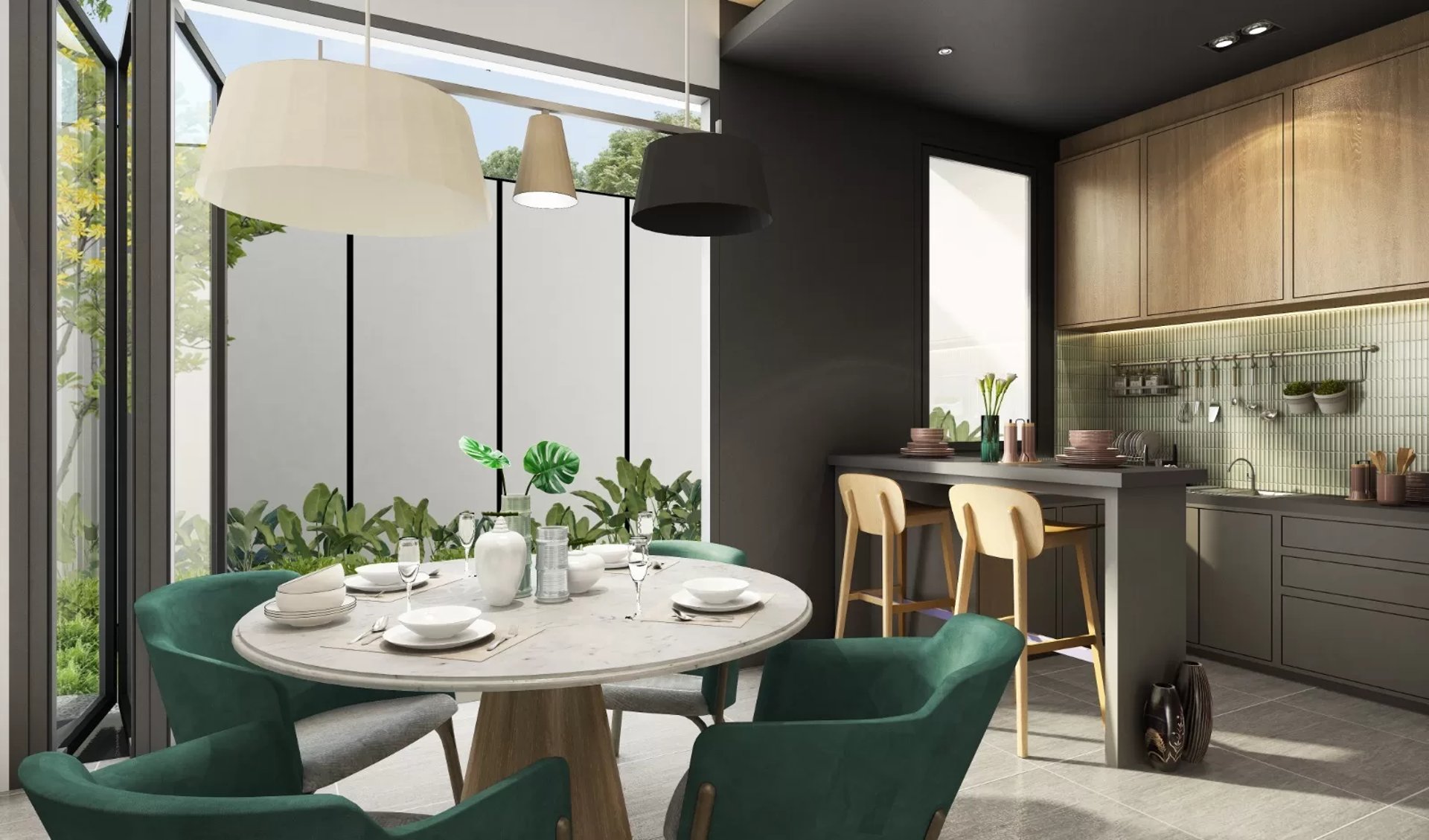 Desain arsitektur urban minimalis yang dipadukan dengan sentuhan alam dan ruang terbuka hijau yang menyegarkan.